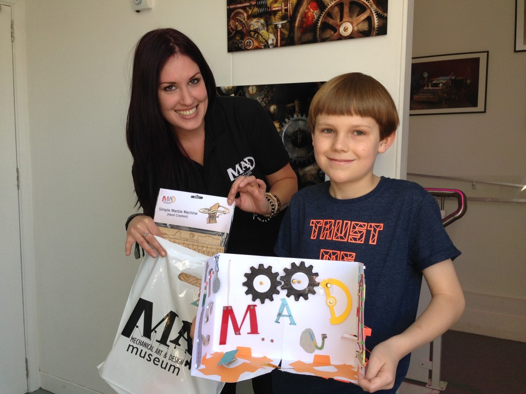 – Here is Matthew with our Issy picking up his goodie bag at MAD.
